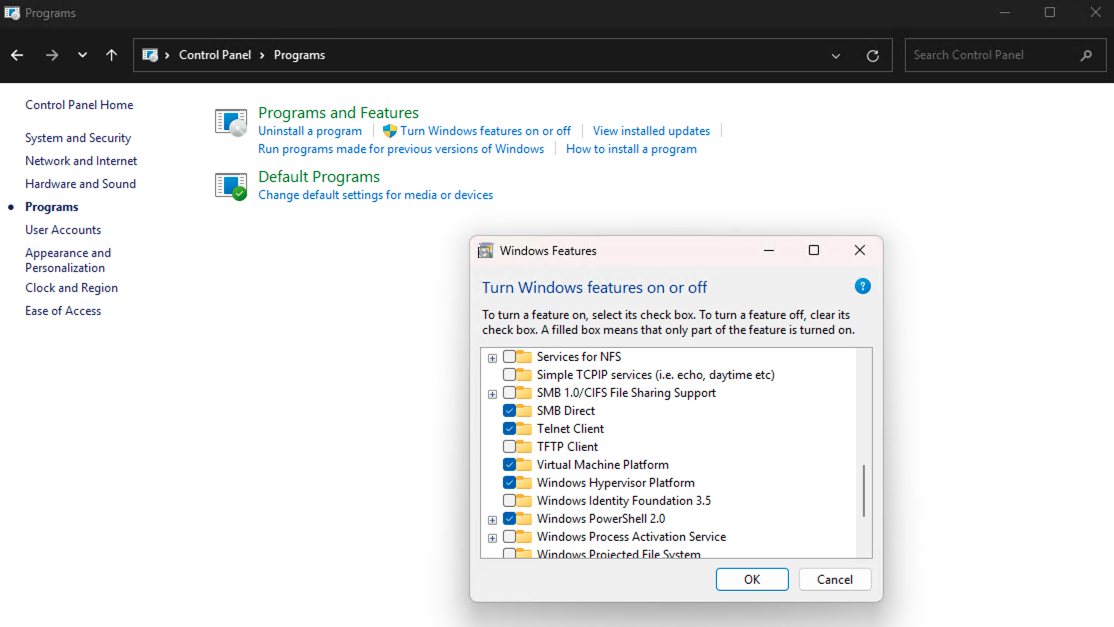 Open the Control Panel, go to “Turn Windows features on and off” under the “Programs and Features” section.
