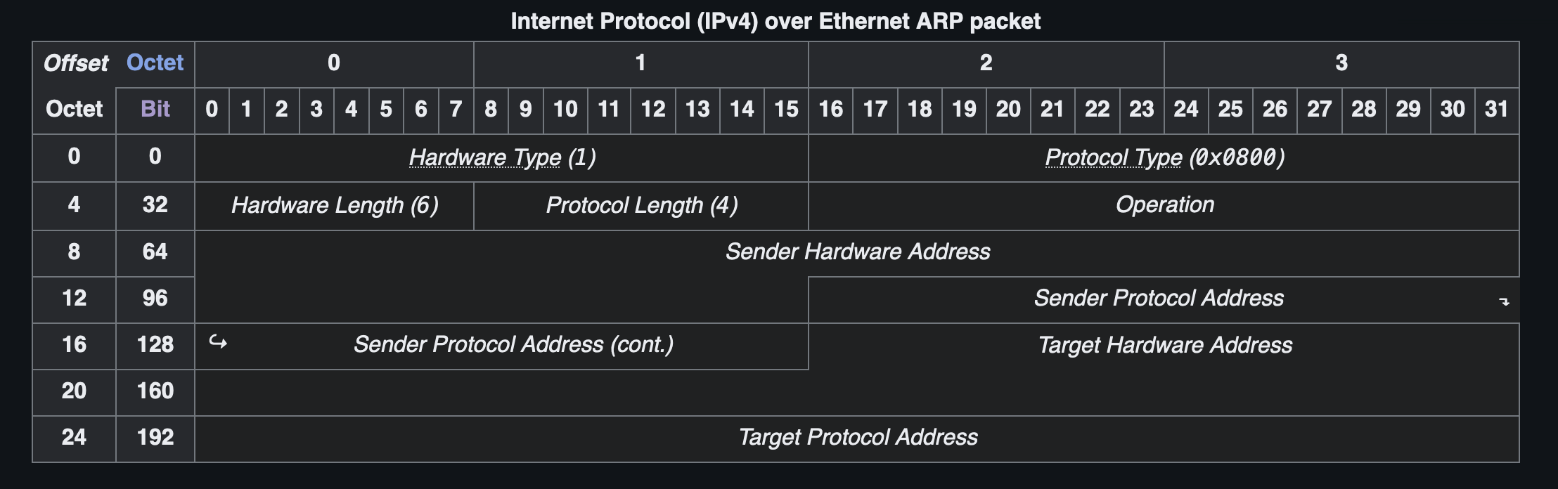 Before we preform the attack, it’s essential to understand the structure of an ARP packet. The principal packet structure of ARP packets is shown in the following picture which illustrates the case of IPv4 networks running on Ethernet.