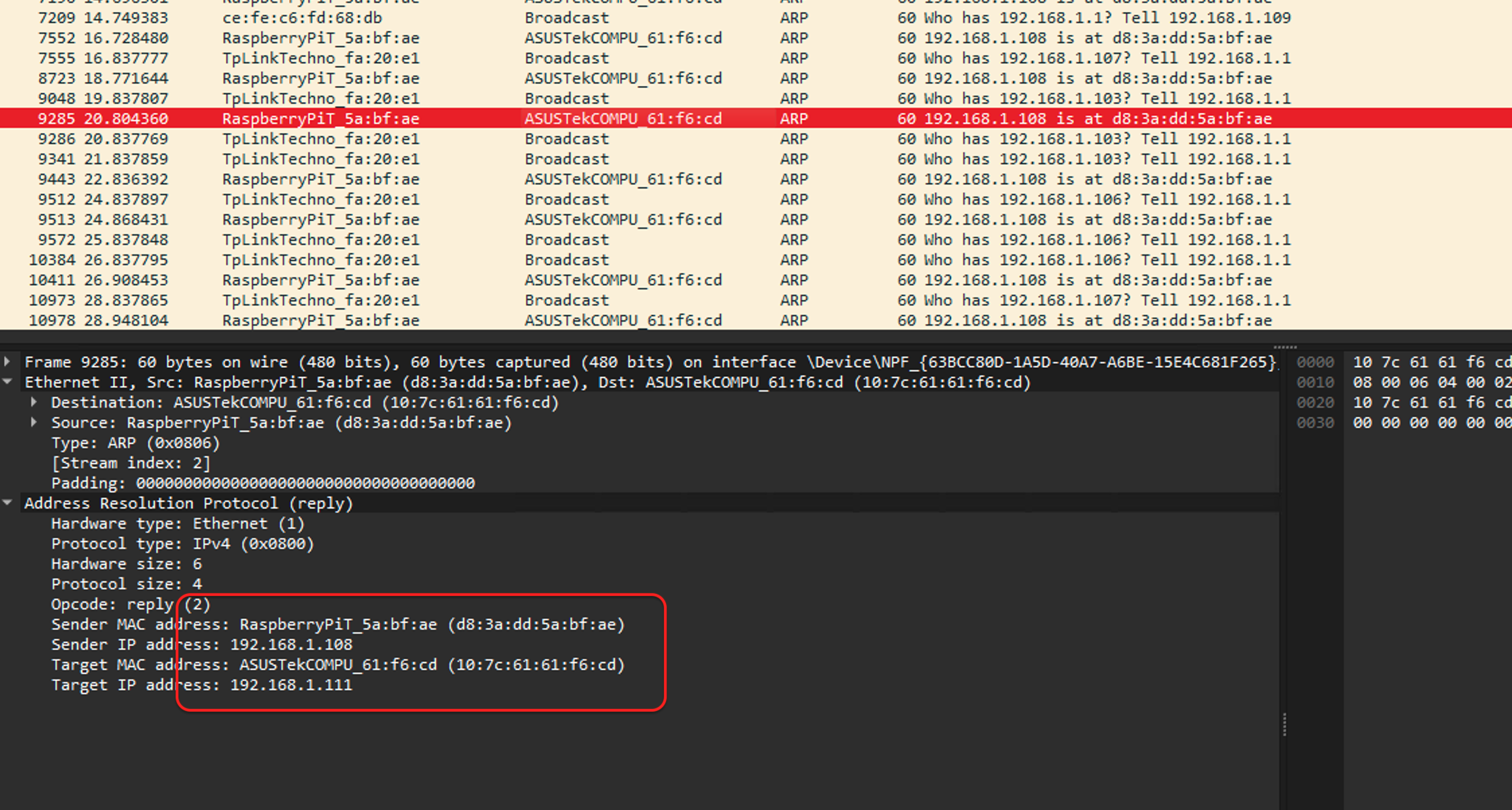 After running this script, it will continuously send forged ARP packets into the LAN. When the victim receives these packets, it will overwrite the ARP table entry for the IP address 192.168.1.108 with the attacker’s MAC address d8:3a:dd:5a:bf:ae. We can observe that the victim has received numerous forged ARP packets: