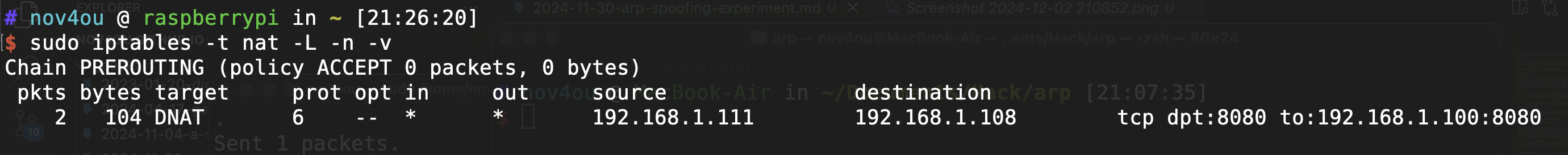 The ICMP packets will be automatically forwarded if IP forwarding is enabled. To deceive the victim into believing it is accessing the Mac server, while in reality, it is connecting to the server running on the Raspberry Pi, we need to add a specific rule to the IP forwarding configuration: